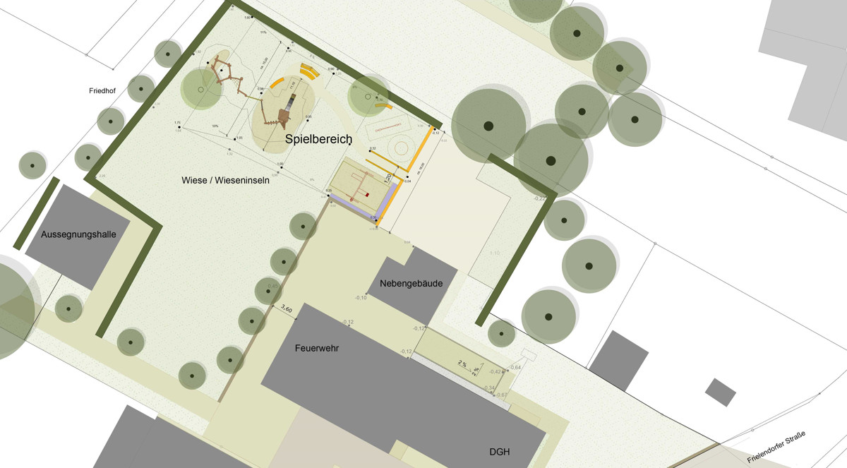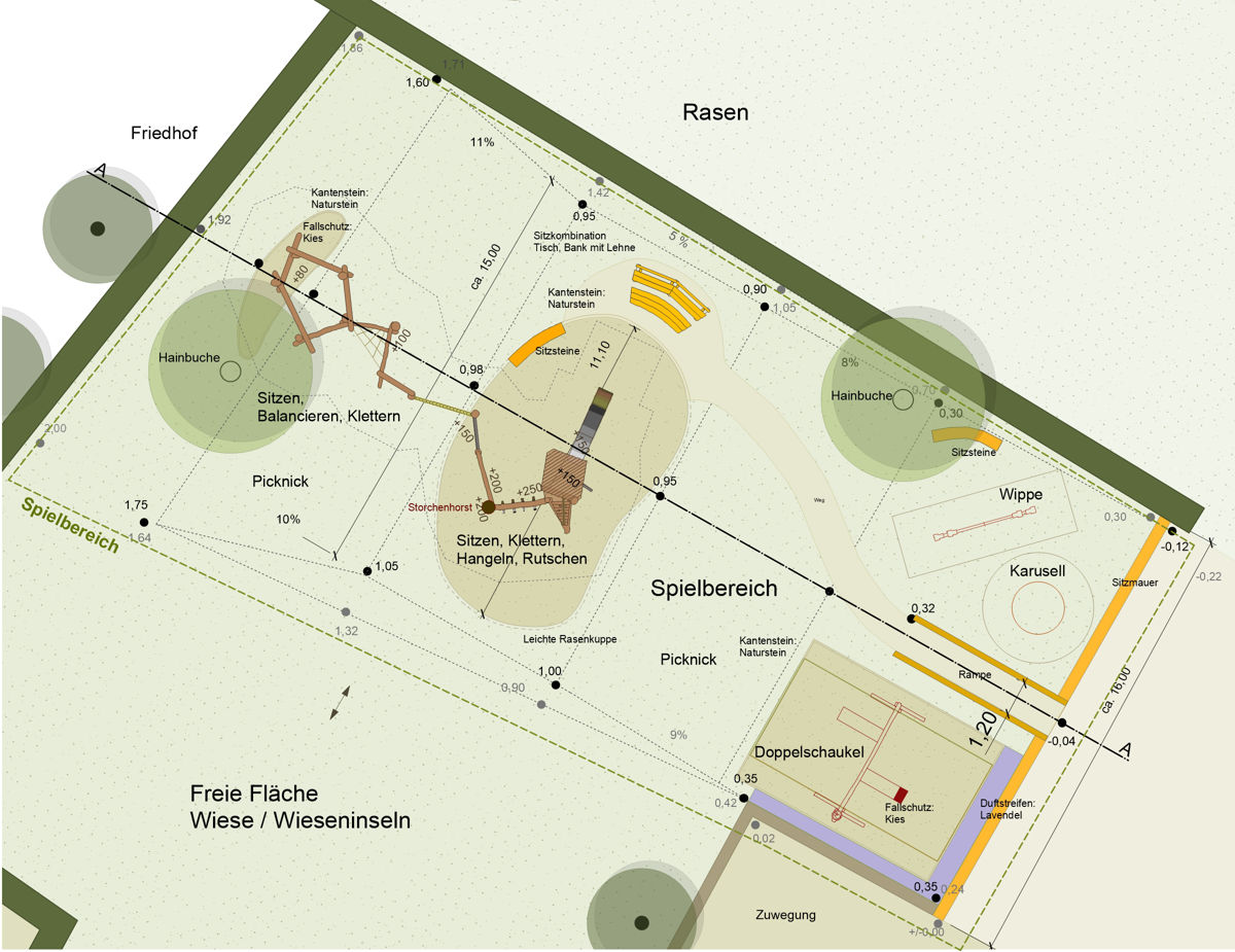 Die zukünftige Spielplatzfläche im Nordwesten des DGH wird neu modelliert, sodass die bestehenden Spielgeräte Wippe, Karussell und die neue Schaukel in der unteren Ebene Platz finden können. Oberhalb dieser Spielgeräte entsteht ein leicht terrassierter Hang mit einer eigens dafür geplanten Spielstruktur. Die obere Ebene bietet einen Blick über die Spiellandschaft und ist gleichzeitig der Einstieg in die Balancierstrecke am Hang, die zu einem kompakten Spielgerät mit einem Storchenhorst führt. Hier gibt es die Möglichkeit zum Rutschen, Hangeln und Klettern.